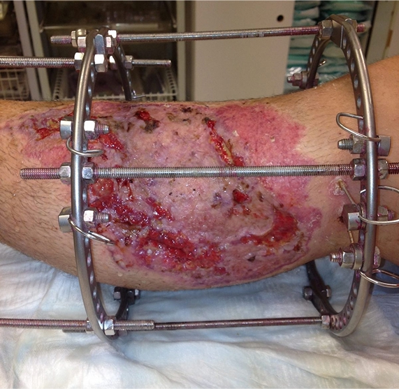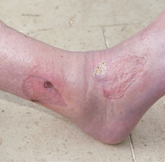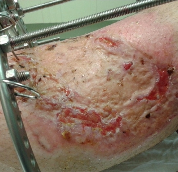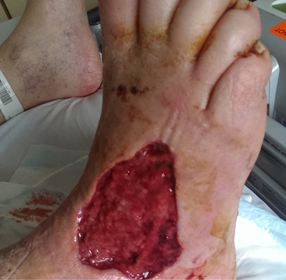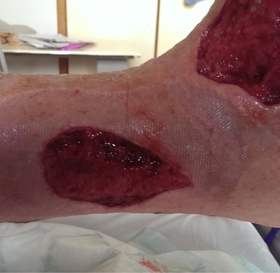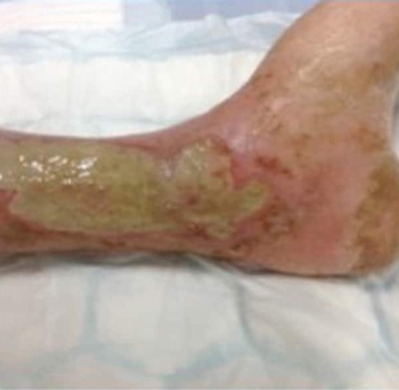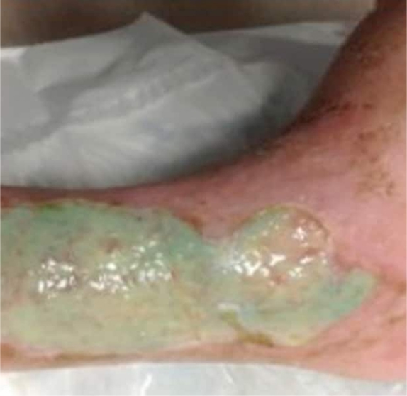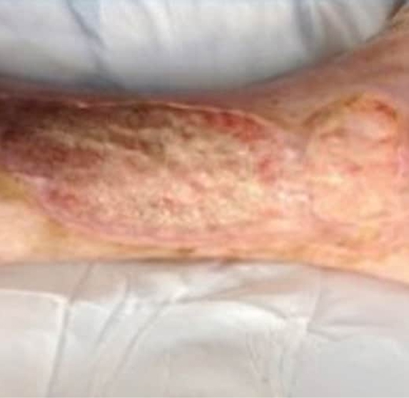 A 77 year old patient with peripheral vascular disease presented with an infected sloughy discharging leg ulcer which was not healing. Samples were collected for microbiology and the ulcer washed with saline to remove slough. The microbiology sample showed a mixed growth of organsims which included MRSA, resistant coliforms and Pseudomonas aeruginosa. The vascular surgery team were keen to start broad spectrum intravenous antibiotics with meropenem (a last resort agent). As the patient did not have sepsis or spreading infection, antibiotics were withheld and topical treatment with Reactive Oxygen® was commenced. By day 10 the ulcer was clean and showed health healing granulation tissue.